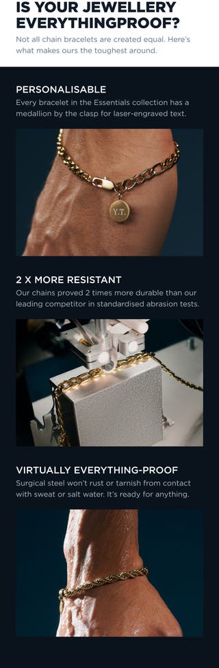 Worn alone, the narrow gold chain adds a subtle, polished accent and pairs well with casual or dress shirts. It layers neatly under a watch or with other bracelets for a tidy, put-together look. The small round tag at the clasp adds a little detail without bulk.