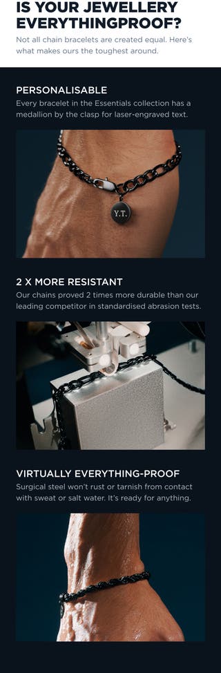This bracelet pairs a slim black chain with 316L stainless steel for a clean, low-profile look. The metal is nickel-free so it sits comfortably against the skin. The dark finish keeps the style understated and modern. A small round tag by the clasp adds a neat detail without bulk.
