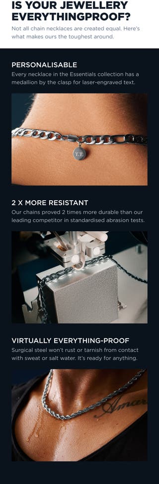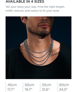 The narrow, reflective surface catches light subtly and sits neatly against a shirt or under a jacket. It works well with casual tees, button-up shirts or other chains for a layered look, adding a restrained metallic accent without stealing focus from your outfit.