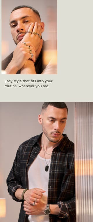A sleek watch, paired with water-resistant surgical steel bracelets, rings, and necklaces, completes your casual style.