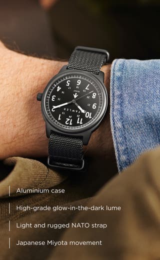 This watch combines a green aluminium case, domed sapphire crystal and matching nylon strap for a military-inspired look. The black dial shows clear 12-hour numerals, inner 24-hour markers and bold hands for quick, easy reading. The design uses durable materials and simple, functional details.