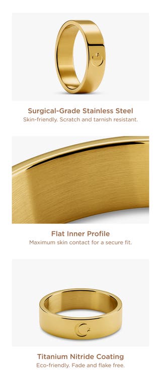 Made from 316L stainless steel with a gold-tone finish, this ring has a low-profile band and a clean, modern look. The polished exterior features a precise engraved crescent and star. A brushed inner surface and rounded edges are designed for a comfortable fit. The gold-tone look and simple shape make it easy to pair with other pieces.
